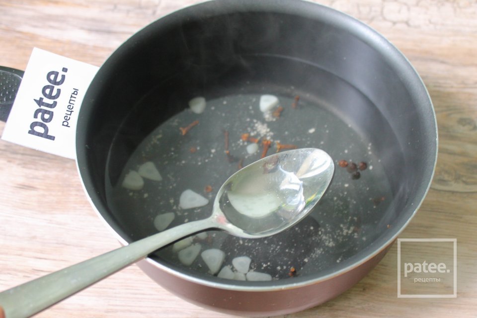 Залейте специи 400 мл воды и вскипятите все. Как только маринад закипит – выключите огонь и влейте либо 1 ст.л. уксуса 9%, либо 1 ч.л. уксусной эссенции. Не переживайте, если маринад мутный – уксус его сделает прозрачным.