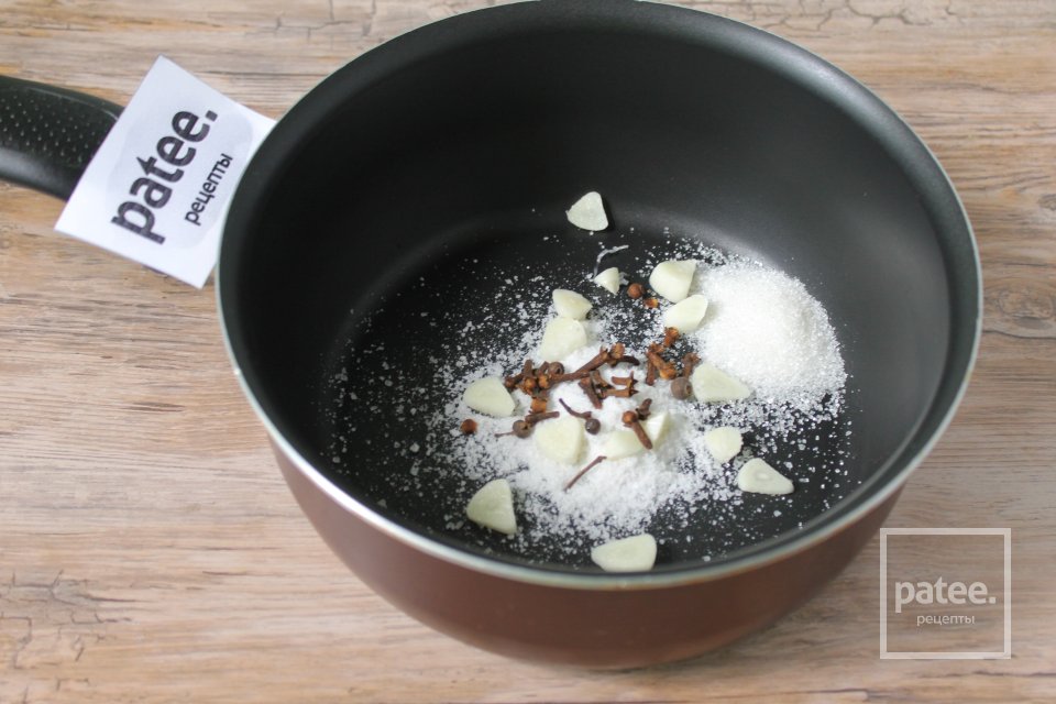 В сотейник всыпьте подготовленные специи и сахарный песок. Очистите зубчики чеснока и нарежьте их слайсами прямо в емкость. Аккуратно добавляйте гвоздику – не стоит перебарщивать, иначе маринованные огурцы будут иметь очень противный вкус.