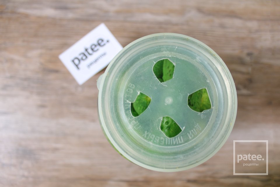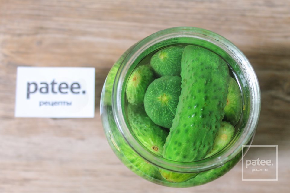 Затем, придерживая крышечкой огурцы, чтобы они не выпали, переворачиваем баночку над кастрюлей, чтобы слить рассол обратно (он заметно покраснеет). Снова ждем, когда он дойдет до кипения, и наполняем банки по второму разу.