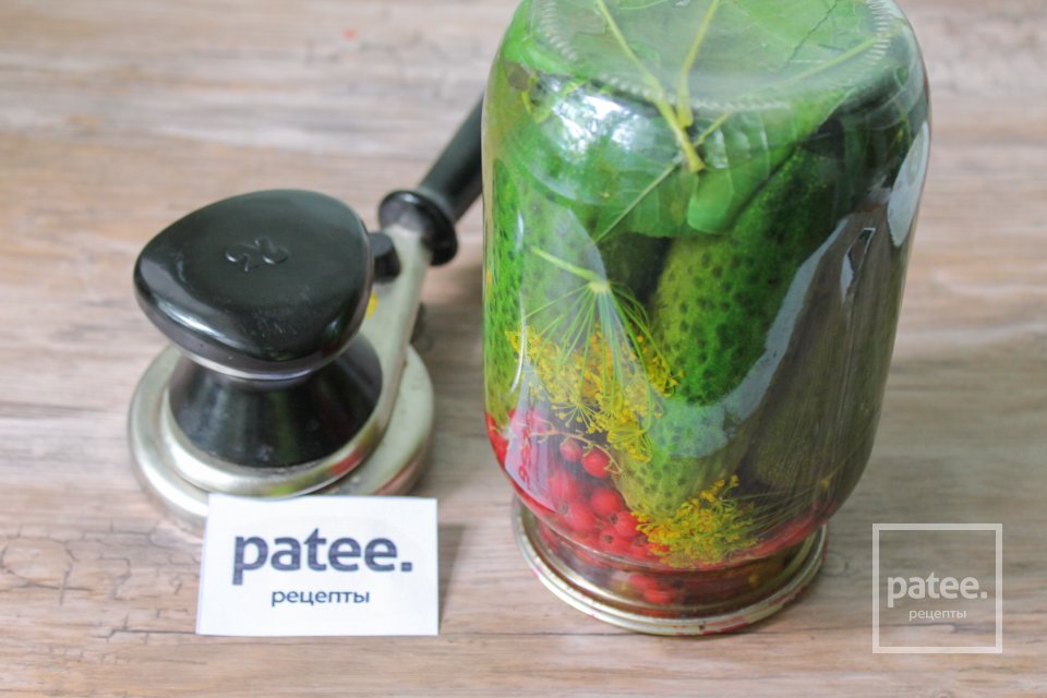 Влейте маринад и закатайте банки горячими крышками с помощью консервного ключа. Переверните каждую банку верх дном, чтобы послушать – не выходит ли воздух, и оставьте ее в таком положении остывать.