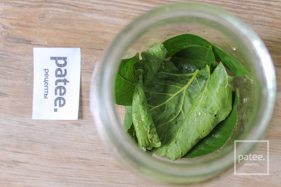 Перед тем как наполнять банки продуктами, простерилизуем их любым из удобных способов. Для консервации огурцов с ягодами красной смородины выкладываем на дно зубчики чеснока, очищенные от шелухи. Засыпаем горошины перца. Отрываем небольшой кусок листа хрена и тоже добавляем к этим ингредиентам в банку. Ну и про зонтик укропа не забываем.