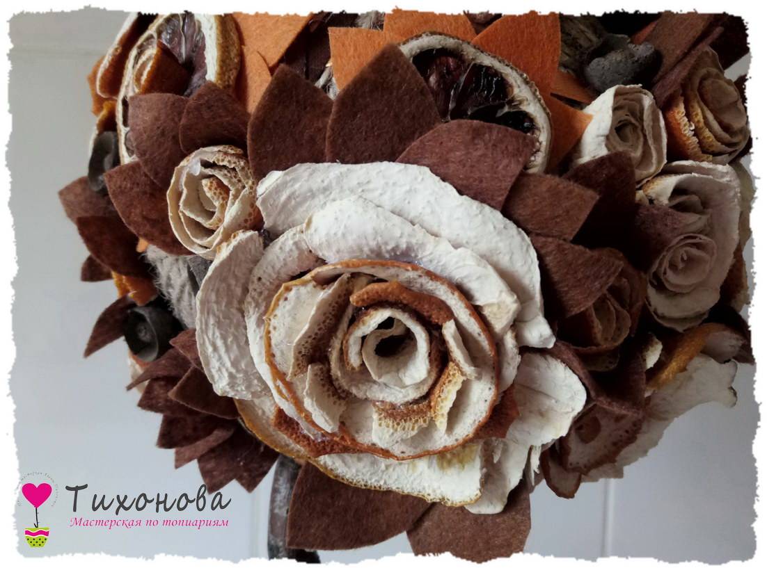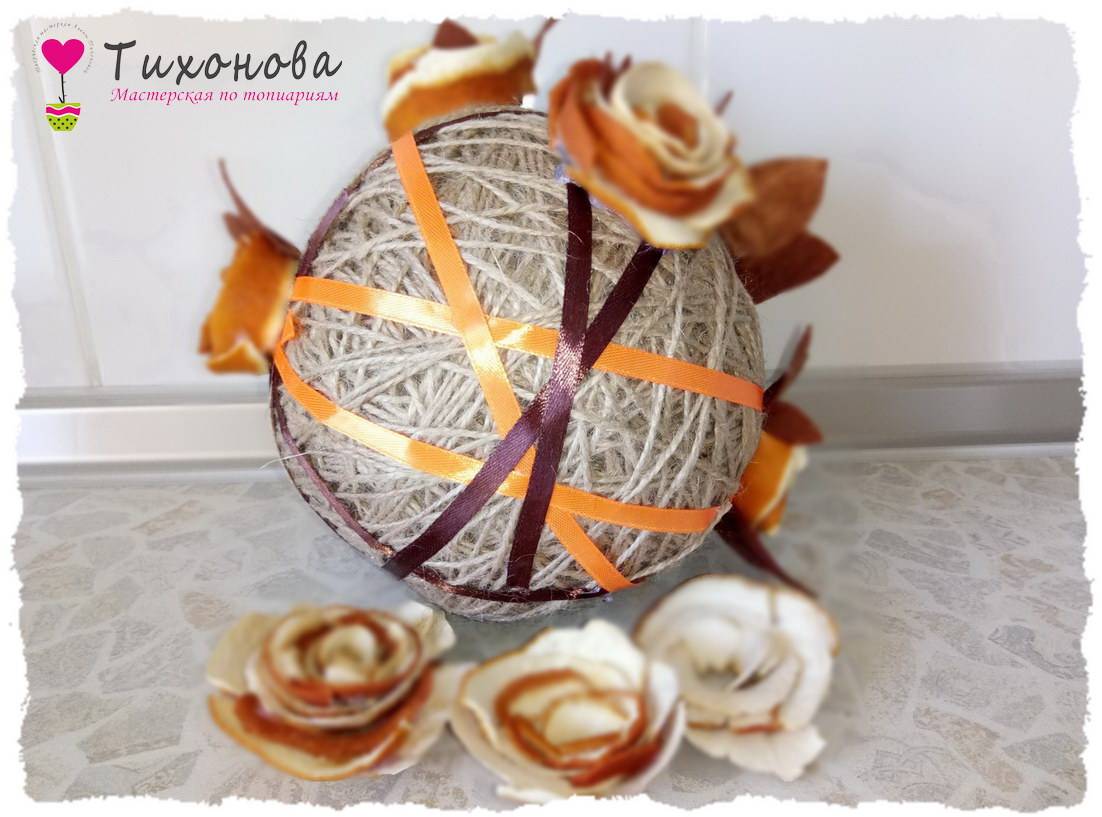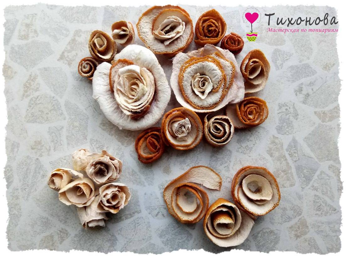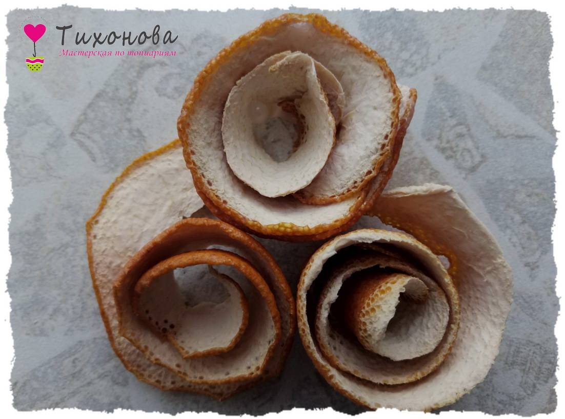 Этап 1. Предварительная сушка цветов и долек. Именно предварительная подготовка — самый важный этап изготовления осеннего топиария из натуральных материалов. Для изготовления роз кожура с апельсина срезается по спирали, размер розы зависит от длины срезанной полосы, а высота — от ширины среза. Для шара d=19 см ориентировочное количество больших роз (d=5-7 см) — 10 шт.; средних (d=3-4 см) — 20 шт.; маленьких (d=1-3 см) — 20 шт.