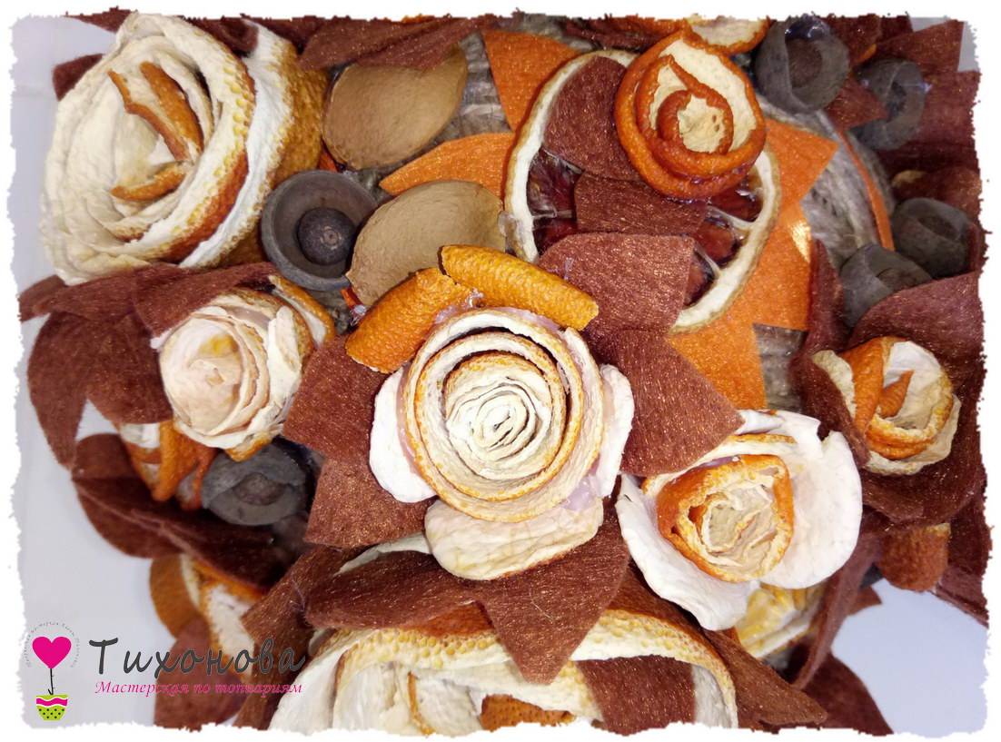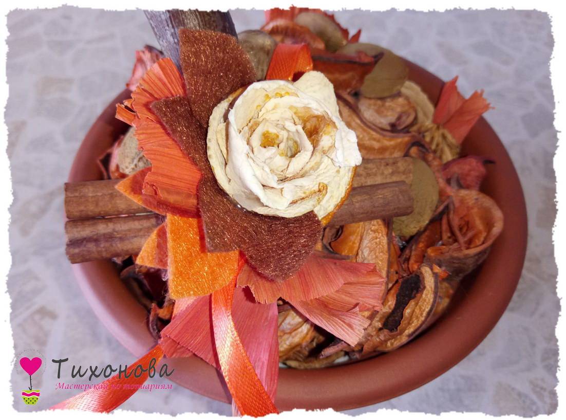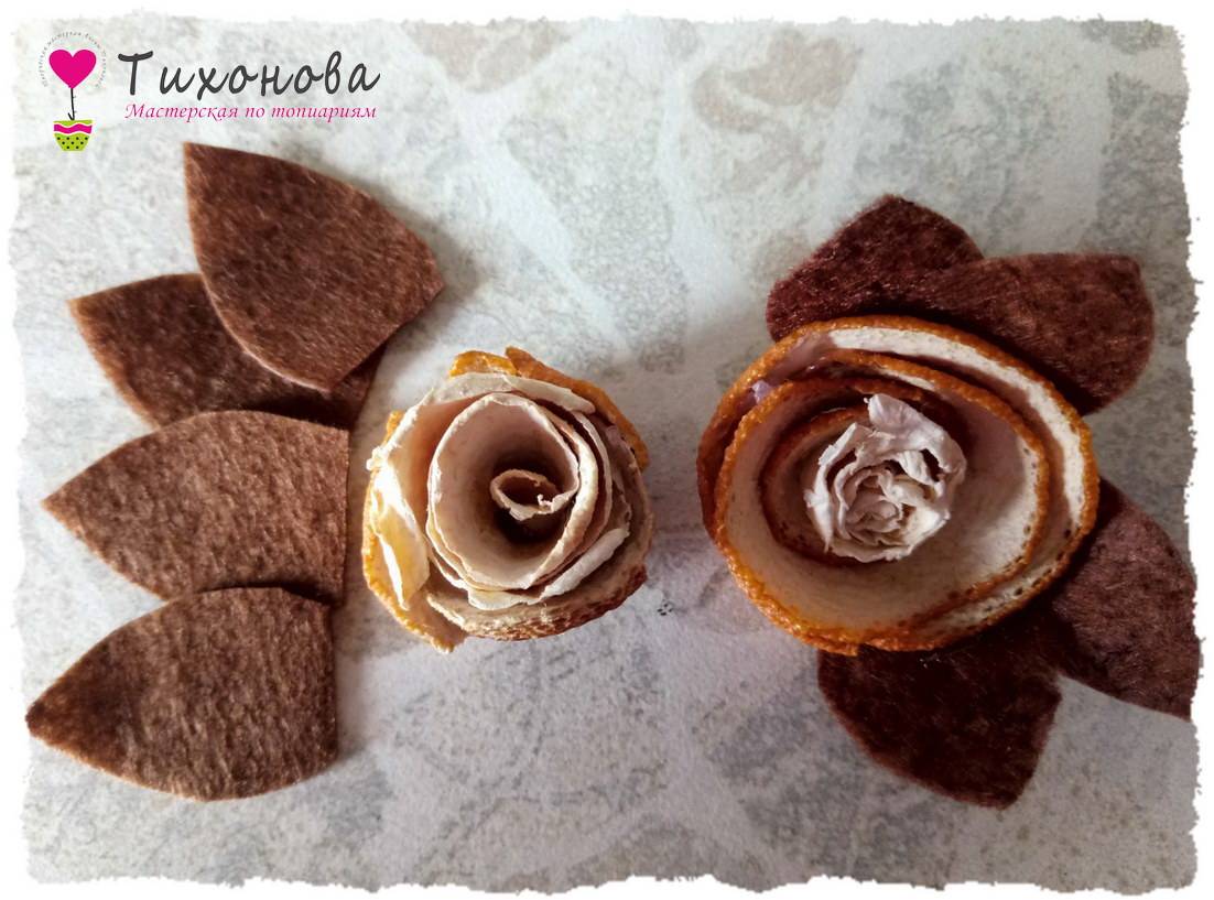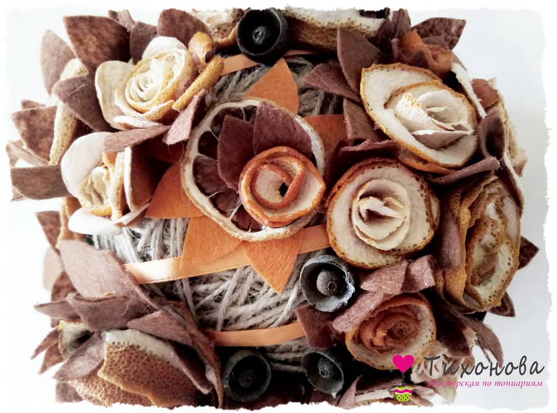Этап 1. Предварительная сушка цветов и долек. Именно предварительная подготовка — самый важный этап изготовления осеннего топиария из натуральных материалов. Для изготовления роз кожура с апельсина срезается по спирали, размер розы зависит от длины срезанной полосы, а высота — от ширины среза. Для шара d=19 см ориентировочное количество больших роз (d=5-7 см) — 10 шт.; средних (d=3-4 см) — 20 шт.; маленьких (d=1-3 см) — 20 шт.