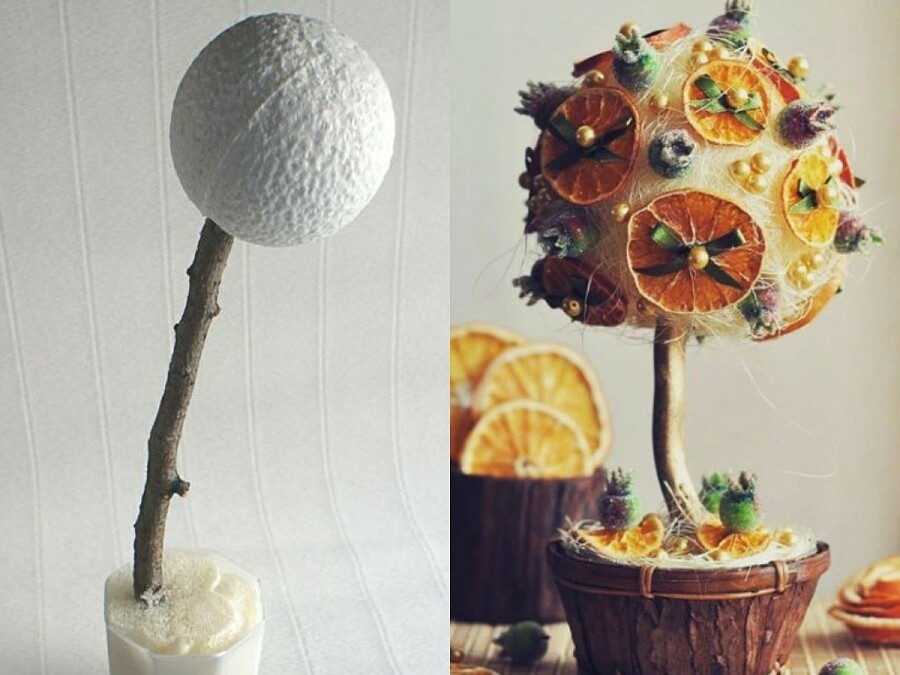 Искусственные топиариии наиболее популярны среди рукодельниц. При должном обращении они способны украшать вашу квартиру годами. В качестве основы для такого изделия чаще всего используется пенопласт или вата, поскольку с ними удобнее всего работать. После обработки на основу прикрепляются различные украшения. Это могут быть любые материалы, начиная от кофейных зерен и заканчивая яичной скорлупой.
