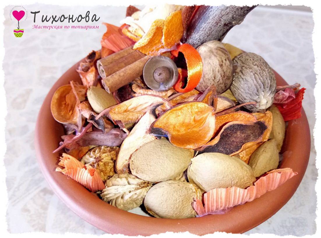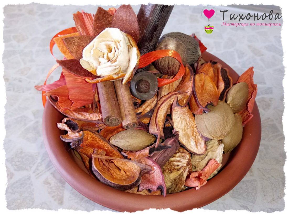 Представленный топиарий из природных материалов — уникальный: декор для него заготавливался постепенно целый год, чтобы быть собранным осенью! Весной — апельсиновые корки; летом — абрикосовые и персиковые косточки; осенью — сухоцветы и плюска желудя. Кроме того, благодаря обилию разнообразных природных материалов дерево счастья источает едва различимый, очень приятный аромат.