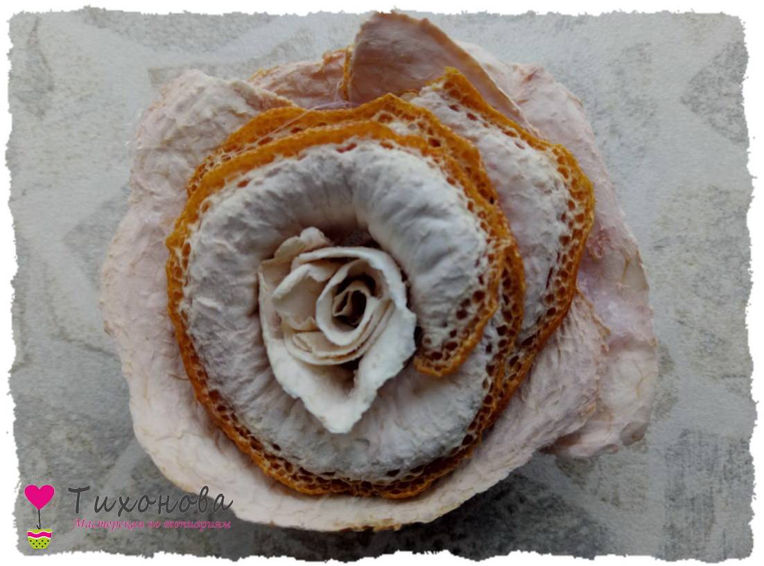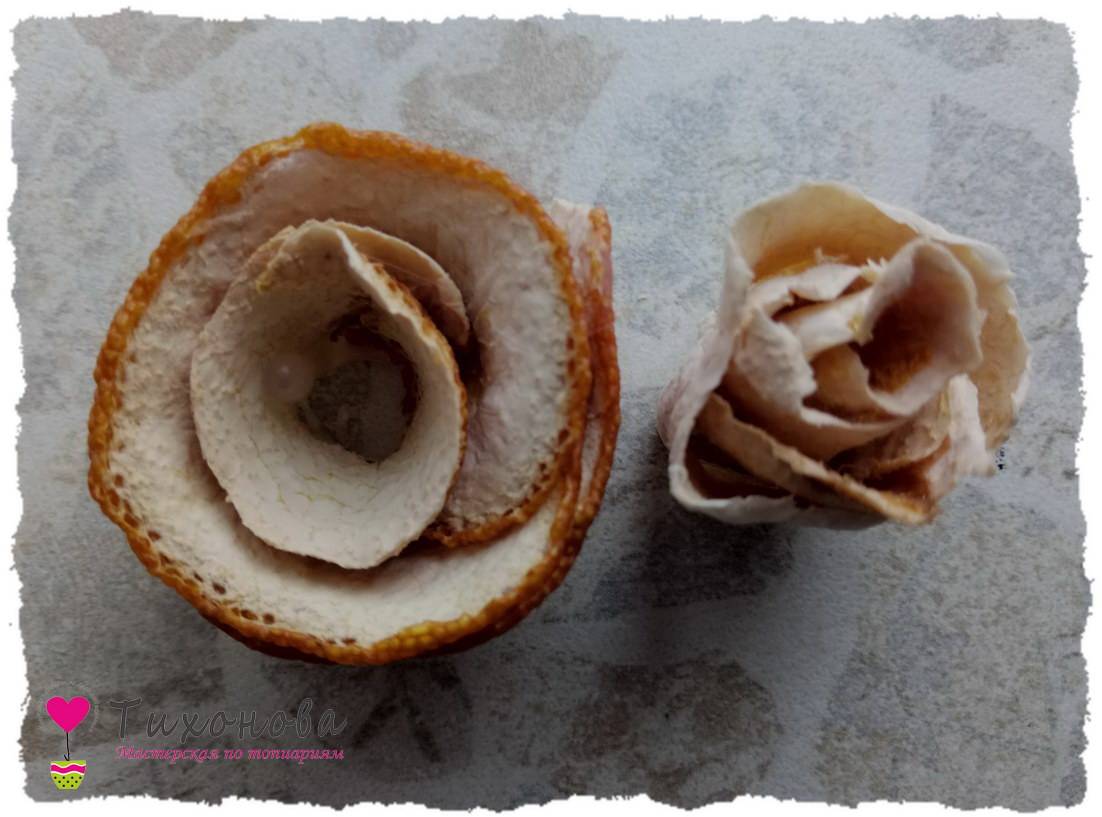 Этап 2. Формирование крупных роз. Для больших цветков — вклеиваем подходящие по размеру белые сердцевины. Розы из апельсиновых корок готовы — и это лишь один способ сделать цветы из кожуры апельсина!