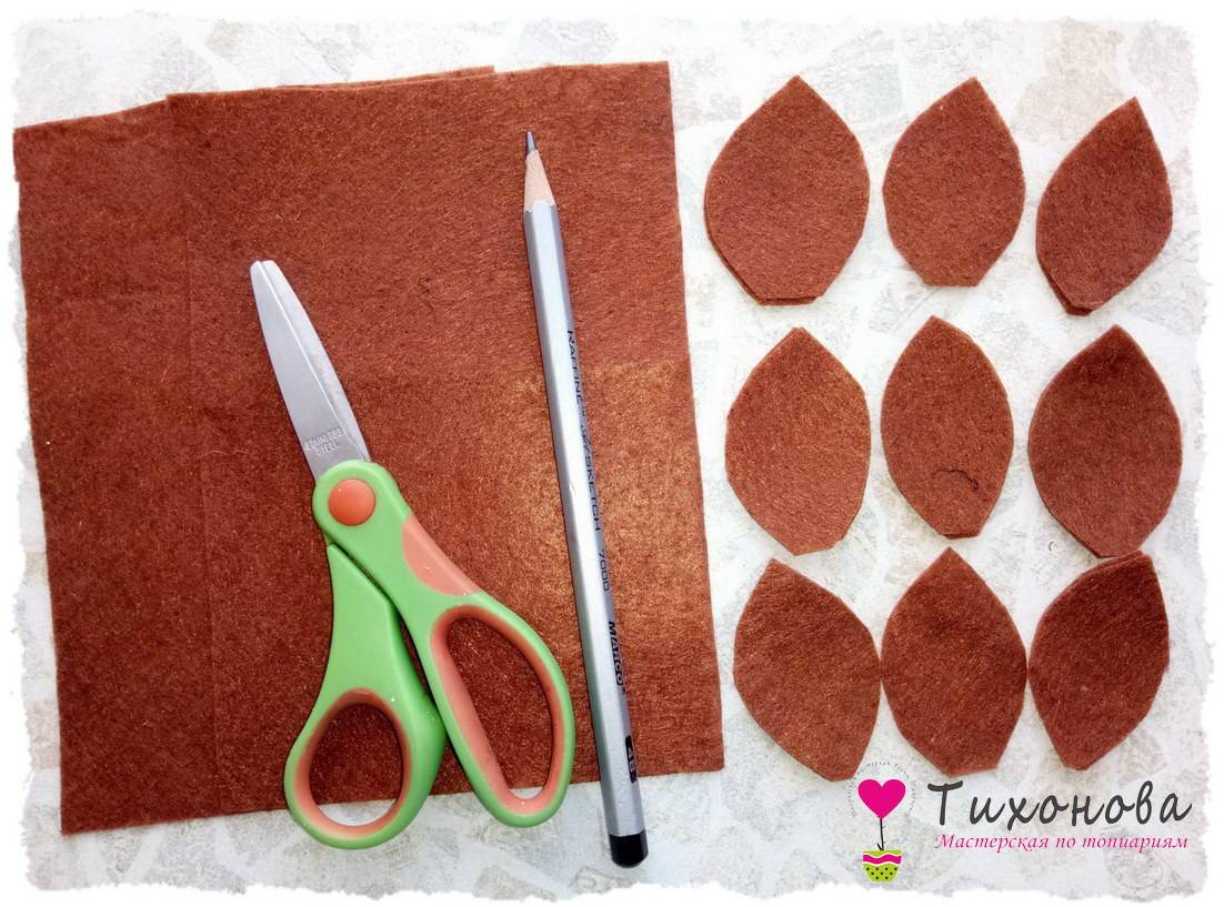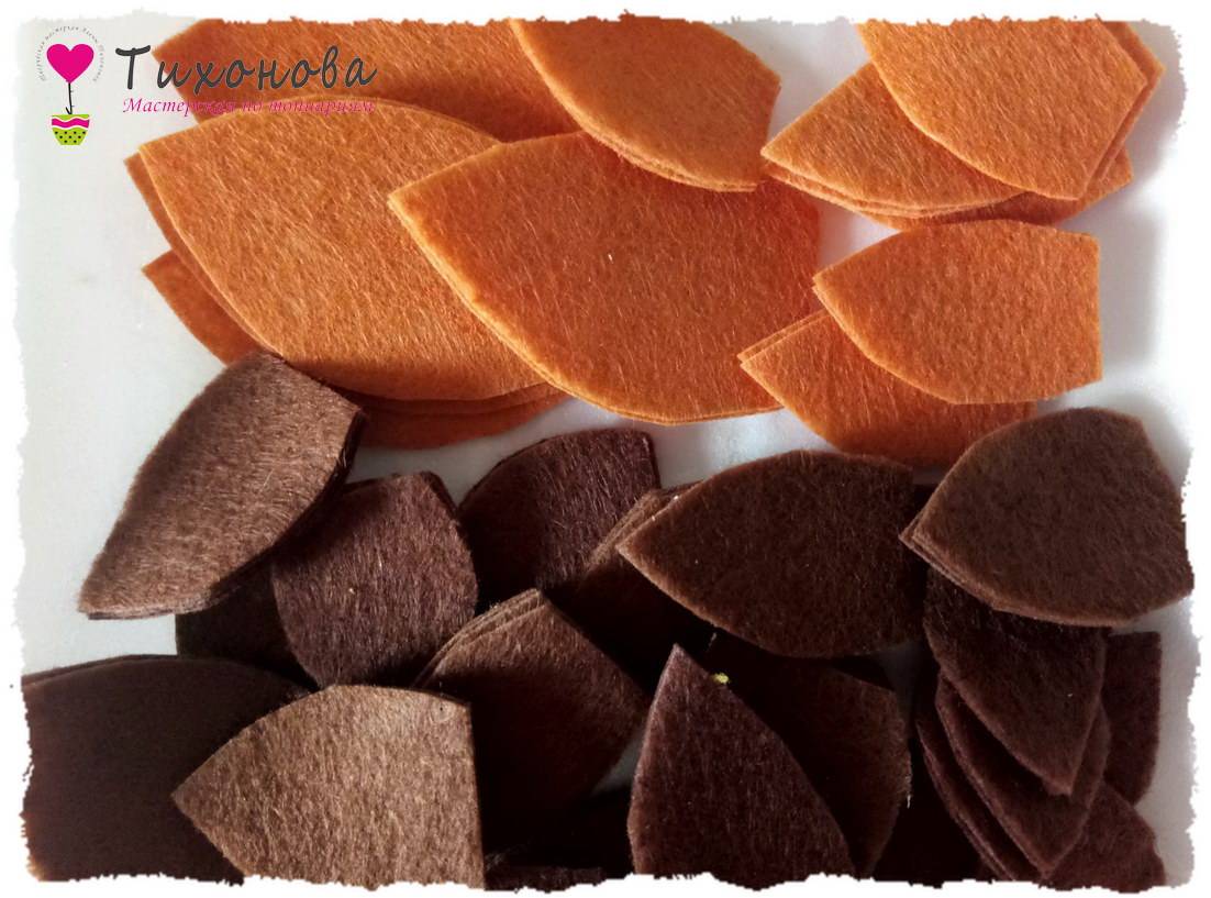 Этап 3. Приклеивание листиков. Из листов фетра вырезаем осенние листики в форме «рыбки». Использован оранжевый и шоколадный фетр А4 формата, ориентировочный размер листиков — 1/32 и 1/64 листа. На топиарий из природного материала листиков нужно много — режем все подготовленные листы (шоколадный — 2; оранжевый — 1).