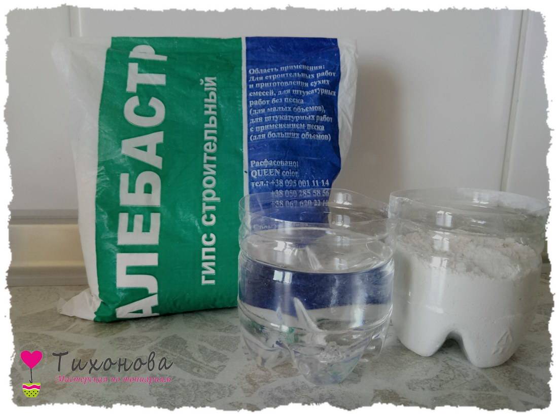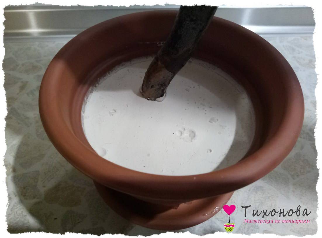 - Лучший вариант – алебастр. На один горшочек хватит 1 кг порошка, размешанного в 600 мл воды до консистенции густой сметаны.