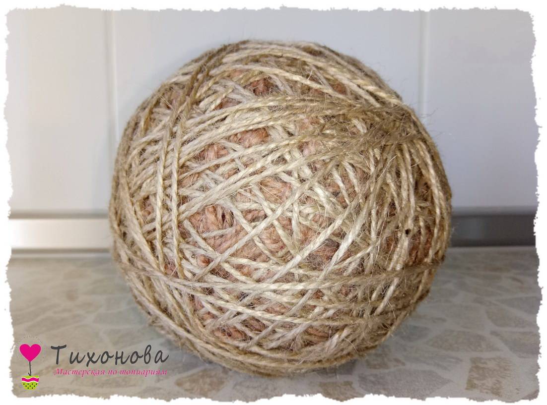 , придаем сферическую форму и обматываем скотчем, а сверху – бечевкой. Фиксируем ствол в отверстии в шаре на клей.