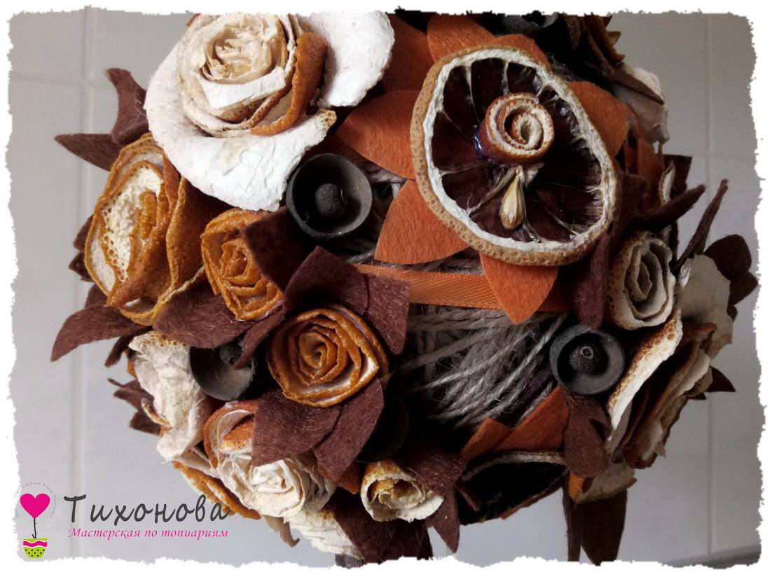 Этап 8. Приклеивание роз. Равномерно по поверхности топиария из природных материалов приклеиваем большие розы, затем — средние и маленькие, а также целые дольки цитрусовых и половинки, оставляя зазоры, как показано на фото.