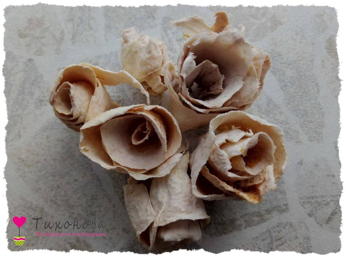 - Так и делаются все лепестки роз. Внизу, у основания цветка они закрепляются нитками. И так делается каждая роза.