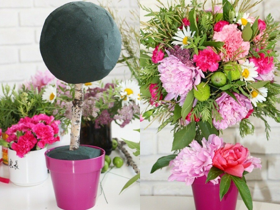 В изготовлении топиариев часто используются не только привычные для рукоделия материалы, но и живые цветы. Поэтому условно их можно разделить на два основных вида: