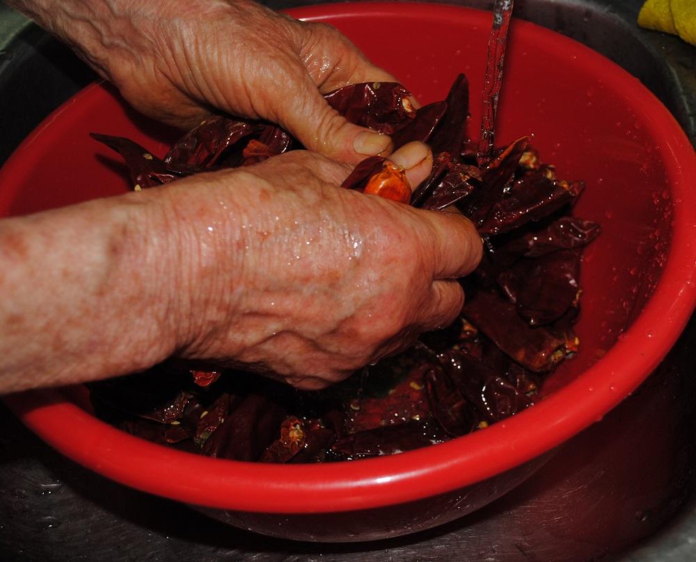 - Просушенные перцы промывают, удаляют семена и плодоножки.
