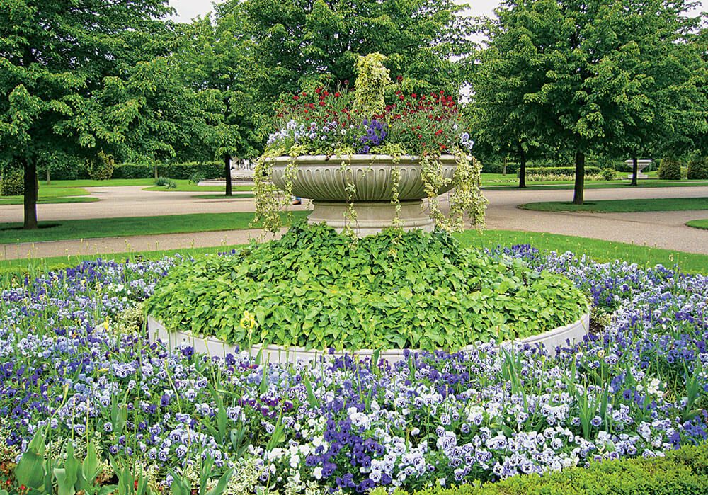 Как правило, растения на клумбе высаживают в виде сложного рисунка. Если клумба небольшая, достаточно 2–5 видов или сортов, на больших площадях потребуется до 10 видов цветочных культур. Если нужен цветник длительной декоративности, подойдет сменное цветочное оформление: на весну высаживают луковичные (тюльпаны, нарциссы, гиацинты, мелколуковичные), раноцветущие двулетники (виола, незабудка, маргаритка), которые затем меняются на летники и ковровые растения. Клумбы устраивают на открытых пространствах, чтобы обозревать их со всех сторон. Для лучшего восприятия края цветника должны быть приподняты над уровнем почвы на 15–20 см. Если диаметр клумбы больше 5 м, ее поверхность делают выпуклой, приподнимая на 5–10 см на каждый метр радиуса. Клумбы хорошо смотрятся возле парадного входа в дом, под окнами террасы, когда рисунок читается с возвышения. В оформлении клумб также используются малые архитектурные формы: вазы, кадочные растения, скульптуры. Высота выбранного элемента должна быть не более 1/3–1/4 диаметра клумбы.