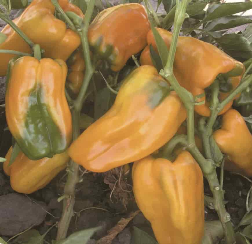 - «Золотая пирамида» – ранний сорт со средней урожайностью в 6-7 кг/м. кв. Растение не очень высокое, ветви растут компактно, много места не занимают. Перчины весят до 105 г, желтые, кожура блестящая, толщина стенки – 8 мм. Ребристость выражена слабо. Сорт стрессоустойчивый, не боится резких перепадов температур, похолоданий.