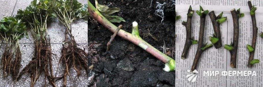Черенки заготавливают из полуодревесневших побегов в конце июня. Их нарезают на части, каждая из которых содержит почки, листья и часть древесины. Пластину листа срезают на половину, а черенки помещают в контейнеры с песком и торфом. Емкости накрывают пленкой и содержат в тепле, ростки регулярно увлажняют. К осени укоренившиеся растения готовы к пересадке в горшки, а высаживание в открытый грунт можно будет осуществить еще через год.