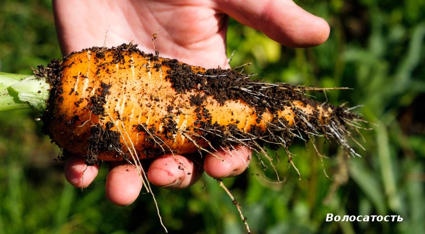 «Волосатые» корнеплоды. Характерный вид, когда морковь словно покрыта «волосками», ей придает большое количество мелких всасывающих корешков, плотно покрывающих корнеплод. Такую морковь можно и нужно есть, она не вредна и сохраняет нормальный вкус, но для хранения не годится. Причина «волосатости» – та же, что у двух предыдущих проблем.