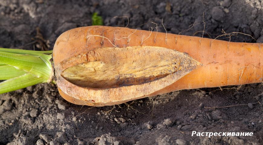 Растрескивание, некрасивая форма плодов, появление наростов могут быть следствием неправильной агротехники. Морковь с такими физиологическими повреждениями обычно съедобна, страдает только ее внешний вид, а не вкусовые качества. Однако для длительного хранения такая морковь не подходит: как правило, лежкость ее довольно низкая, на корнеплодах быстро появляется гниль.