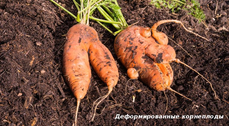 Уродливая форма корнеплодов: ветвление, образование «гроздей». Причины появления уродливых корнеплодов – слишком плотная почва и ошибки в агротехнике. В тяжелых, каменистых или суглинистых почвах морковь ветвится из-за механических препятствий для ее роста. Что касается агротехники, то появление такой моркови может быть спровоцировано внесением свежего навоза или недостатком полива на стадии закладки и формирования корнеплода, то есть в период между посевом и в течение примерно месяца после появления всходов.