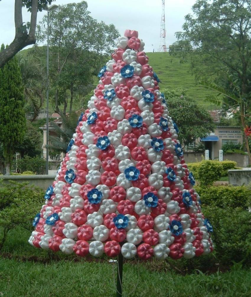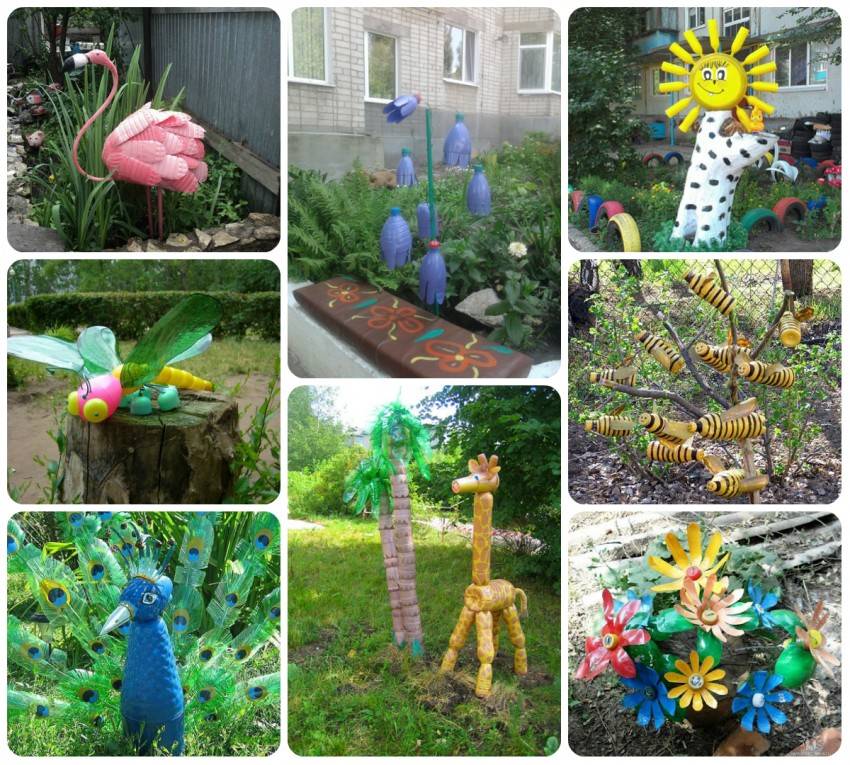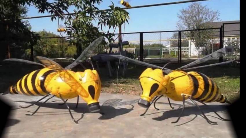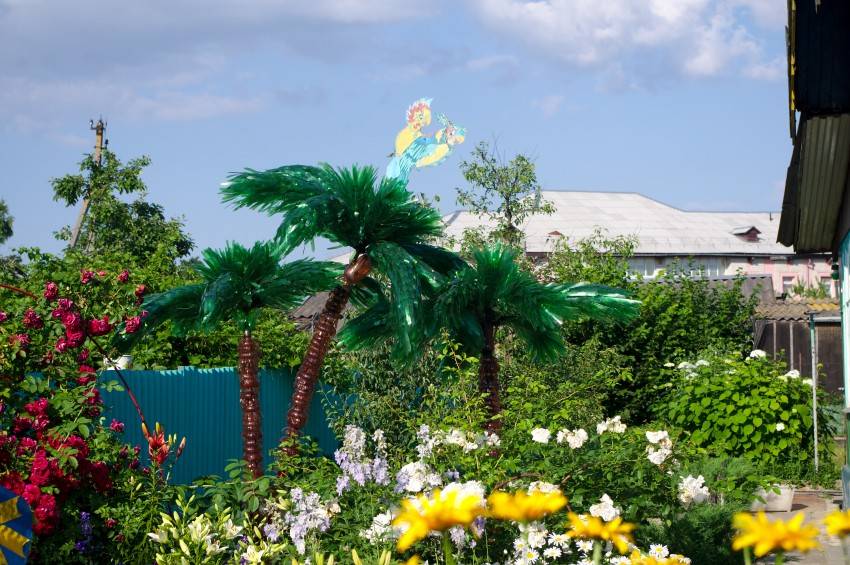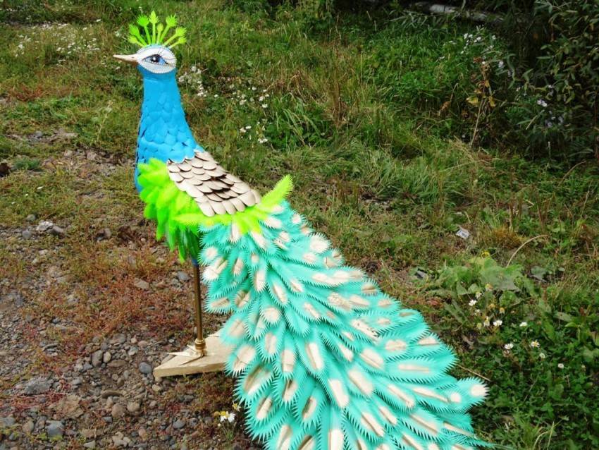 Вначале по эскизу изготавливают каркас поделки из стальной проволоки. Затем с помощью ножа пластиковым бутылкам придают нужную форму и ими покрывают несущую конструкцию. Готовая поделка занимает достойное место в саду.