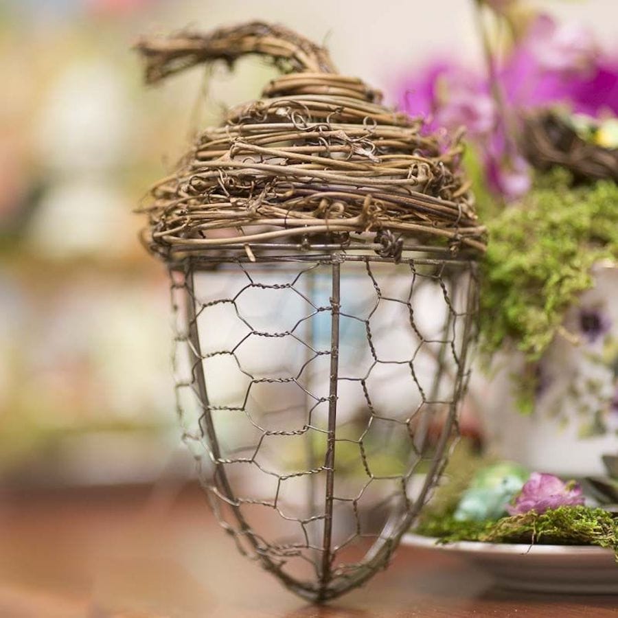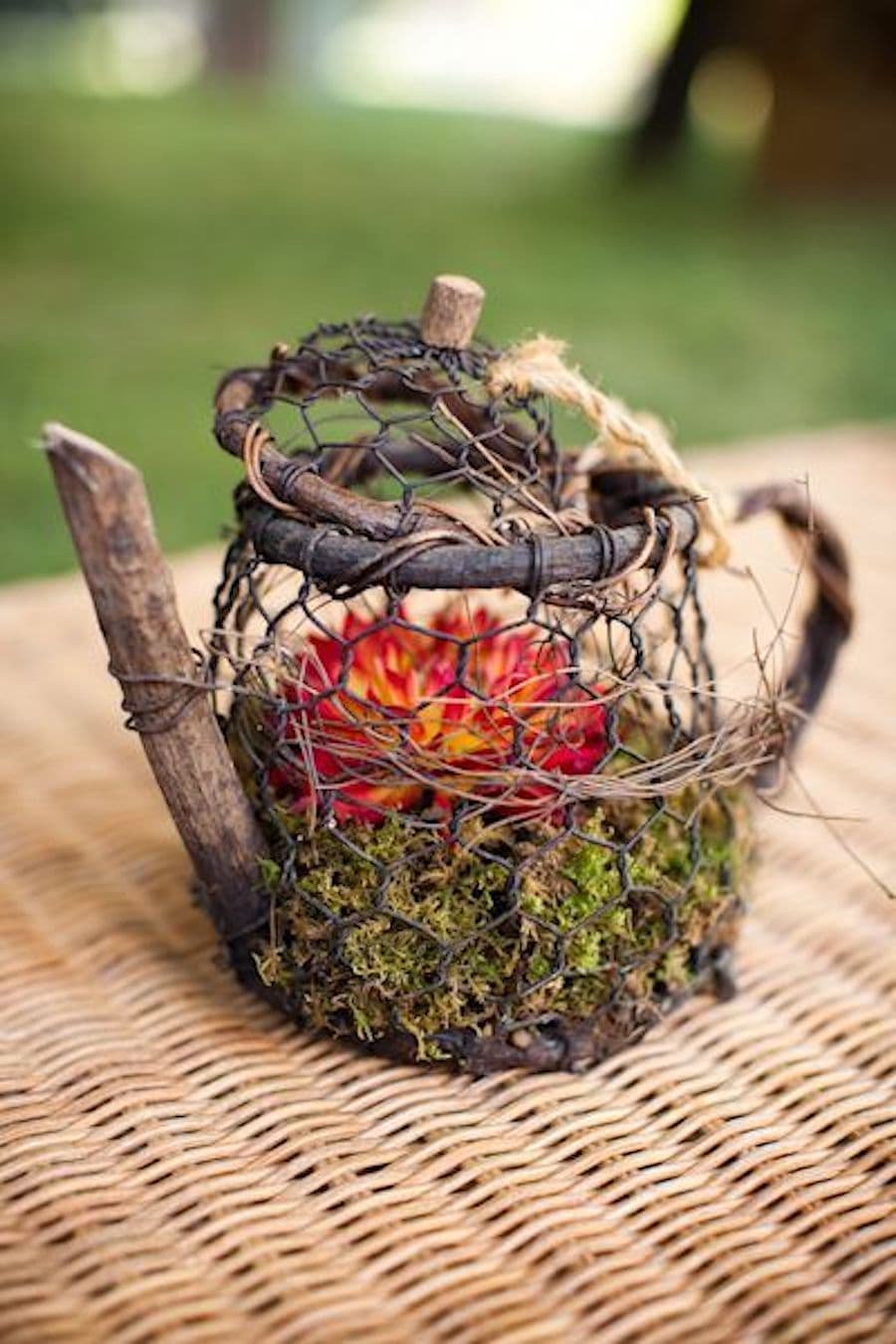 Интересно смотрятся подвесные изделия, изготовленные из оцинкованной сетки, сплетенной проволоки или сваренной арматуры. Из подручных материалов часто используются автомобильные колесные диски или нарезанные на отрезки трубы.