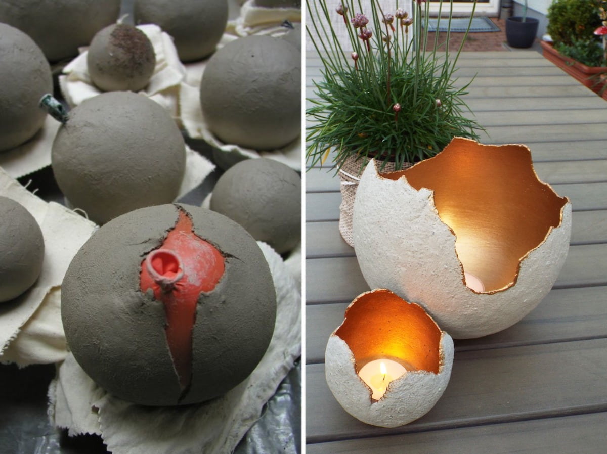 Все чаще на садовом участке появляются колоритные ажурные шары. При их изготовлении толстый шнур пропитывают цементным раствором и окутывают, формируя ажурный узор надутый воздушный шарик. После высыхания, нужно проткнуть и убрать основу. Ажурные сферы при желании декорируют или разрисовывают.