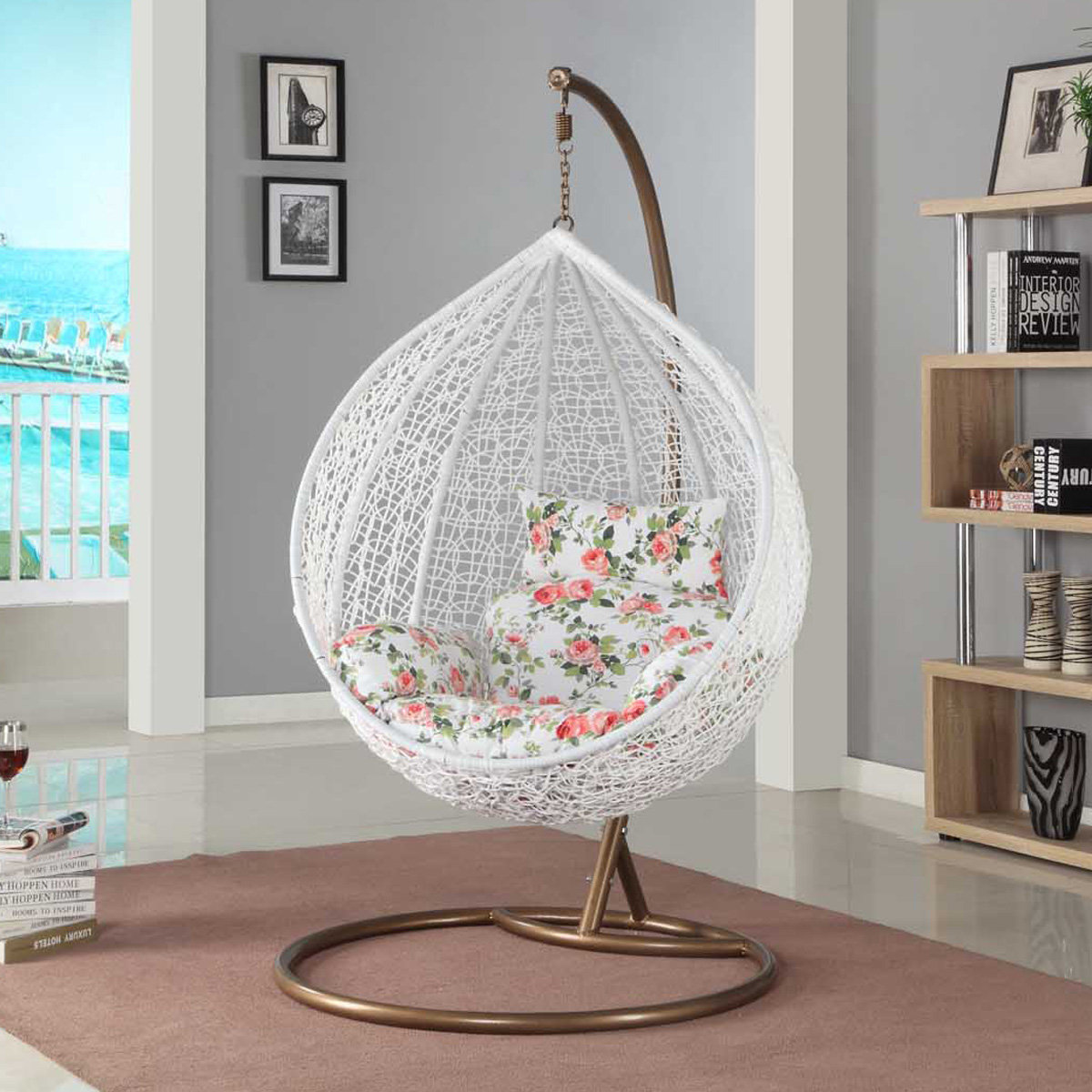 Круглая форма также весьма популярна. Кресла в виде сферы выглядят довольно массивными. Чтобы это сгладить, дизайнеры стали выполнять их в виде ажурных кружев или делать из прозрачных материалов. Отличным вариантом, который будет выглядеть легким и изящным, является круглая основа, сплетенная из разноцветных нитей. Каплевидные формы также занимают одну из лидирующих позиций. Зачастую данные модели отличаются легкостью в монтировании, так как их необязательно крепить к каркасу. Они будут отлично смотреться в любом уголке сада и подходят даже для послеобеденного сна. Особой популярностью эти кресла пользуются у детей, так как в них легко спрятаться.
