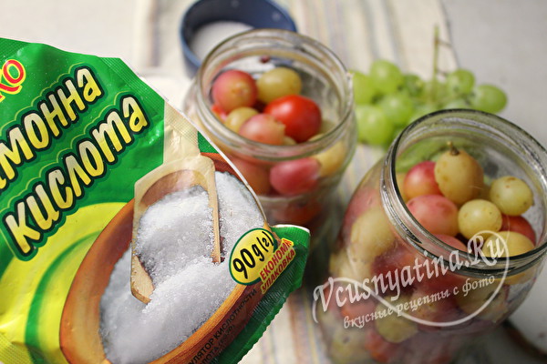 Лимонную кислоту добавьте в банки (треть чайной ложки на литровую банку). Кипящей заливкой заполните банки и закатайте туго крышками.