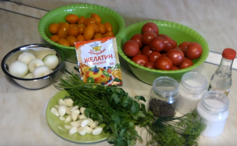 В классическом варианте этого рецепта нам понадобятся просто помидоры, вода, соль, сахар и желатин. Однако для придания готовому блюду приятного аромата можно воспользоваться специями. И о луке не забудем.