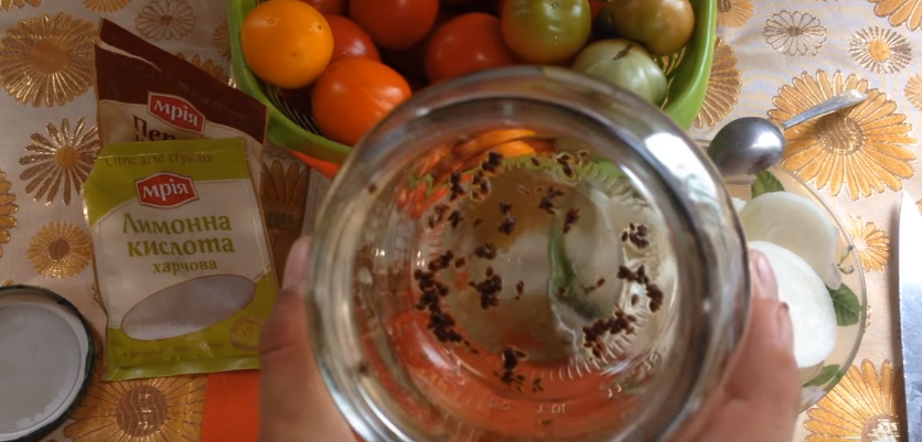 На дно чистой, простерилизованной банки, срываем семена укропа и кладем в банку, они придают интересный вкус помидорам. Затем укладываем на дно лук, лист смородины, несколько горошин душистого перца.