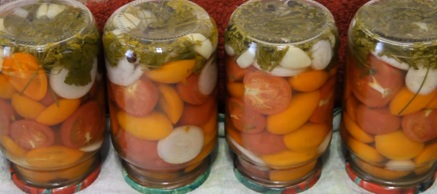 Помидоры в желатине на зиму с луком — классический рецепт «Пальчики оближешь» со стерилизацией