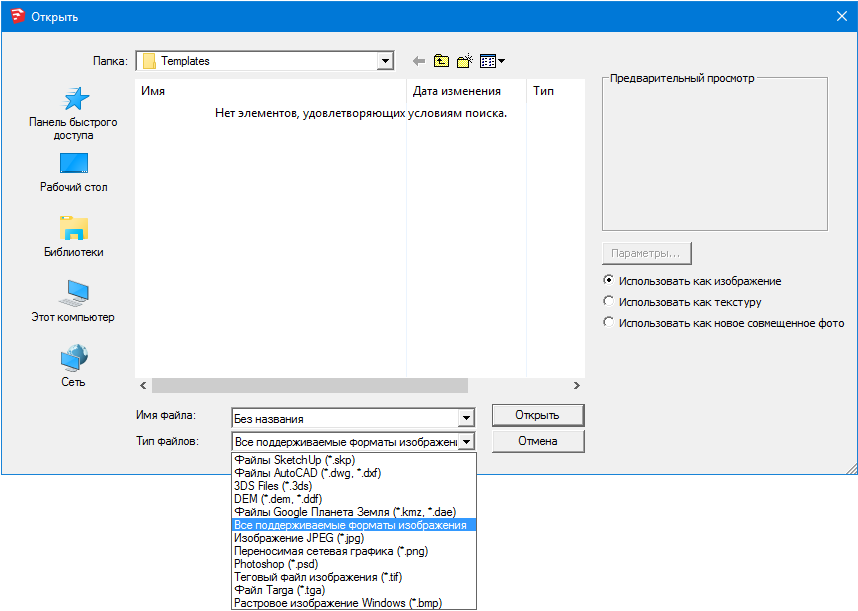Разработанные в SketchUp Rus проекты хранятся в специальном формате с расширением skp. Помимо собственного типа файлов программа поддерживает импорт и экспорт графики из/в форматы ddf, tga, 3ds, dwg и растровую графику psd, bmp, png, tif, и psd. При импорте осуществляется обрезка или изменение размера объекта, вставка его в качестве отдельного элемента сцены, использование в качестве текстуры или фона. Pro версия тем и отличается от бесплатной, что поддерживает большее разнообразие типов файлов. Система Photo Match поможет создать сцену на базе растрового изображения.