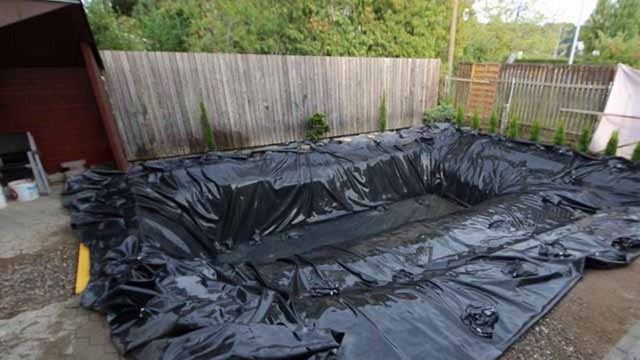- Плотно застелите яму пленкой. Геотекстиль можно уложить под низ для того, чтобы со временем корни деревьев не повредили гидроизоляцию. Кроме того, укрепить конструкцию можно с помощью рубероида или линолеума. Укрепить берег и дно можно и с помощью плотно утрамбованного песка. Рекомендуется выполнять данную процедуру в солнечный день, так пленка нагреется и более плотно ляжет на все изгибы ямы.