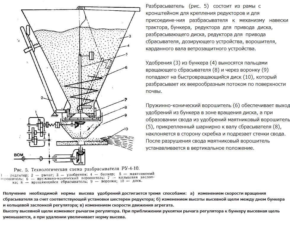 Технологический процесс протекает следующим образом. Удобрение под воздействием ворошильного вала-мешалки равномерно поступает из бункера на распределительные диски, вращающиеся в противоположные стороны. Двигаясь по желобчатым лопастям разбрасывающих дисков, вращающихся с частотой 720 оборотов в минуту, удобрения за счет центробежной силы инерции выводятся наружу и разбрасываются по обе стороны машины, покрывая обрабатываемую полосу.