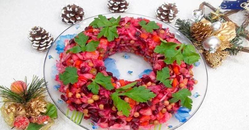 Обычный винегрет делается с душой и рождественским праздничным настроением, укладывается красивым кольцом и украшается розочками из свеклы и зеленью.
