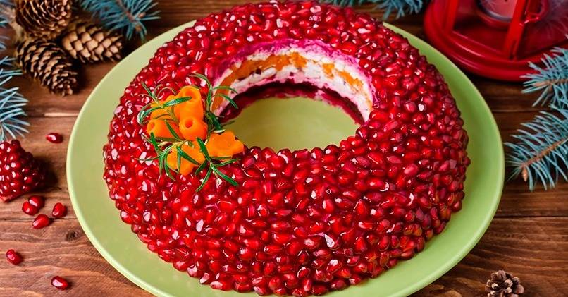 Зернами граната покрываем всю поверхность салата. Делаем из моркови и зелени украшение на “браслете”. Подаем на красивой тарелке.
