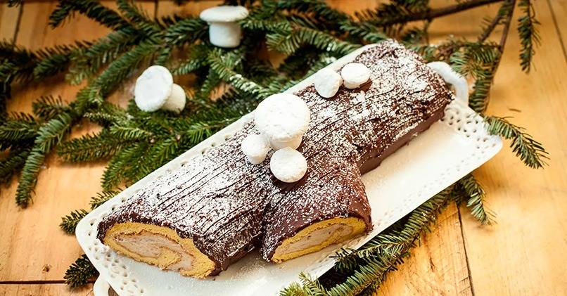 Рождественское полено – бисквитный рулет, главное праздничное украшение во Франции. Французы в Рождество всей семьей собирались у камина и поджигали полено, смазанное медом, вином, маслом. Считалось, что это привлечет удачу и благополучие в дом. Ввиду отсутствия каминов сегодня все просто пекут вкуснейший торт в виде полена с нежным масляным кремом и темно-коричневой глазурью.