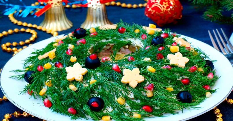 Для украшения будем использовать укроп, зерна граната, консервированную кукурузу, маслины. Из сыра сделаем яркие звездочки. Красота, да и только!
