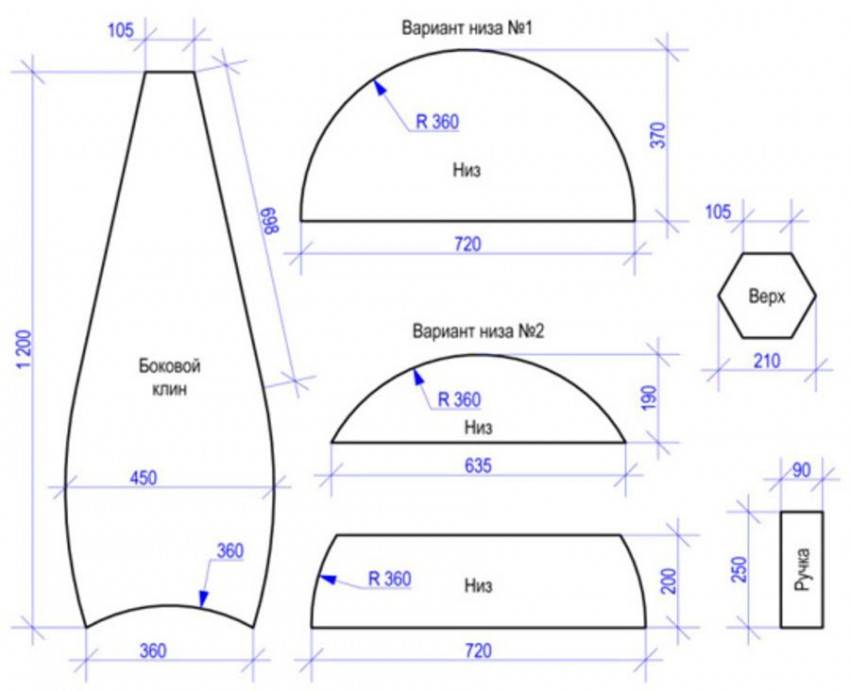За основу можно взять фанеру толщиной 20 мм, а для обивки – водонепроницаемые ткани (термостойкий оксфорд или непроницаемую мембрану). Все детали вырезают по заранее составленным шаблонам, где четко указаны их оптимальные габариты и угол наклона