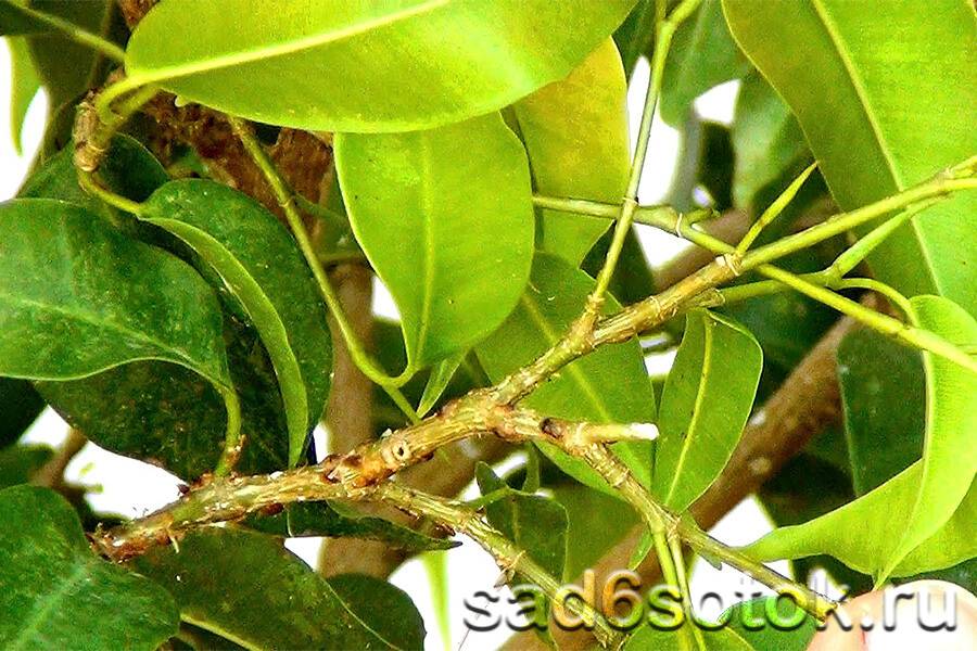 Появление на стволе, ветках или нижней части листьев едва заметных «бугорков» от светло-зеленой до коричневой гаммы говорит о том, что здесь прочно закрепилась колония щитовок – самки и личинки.