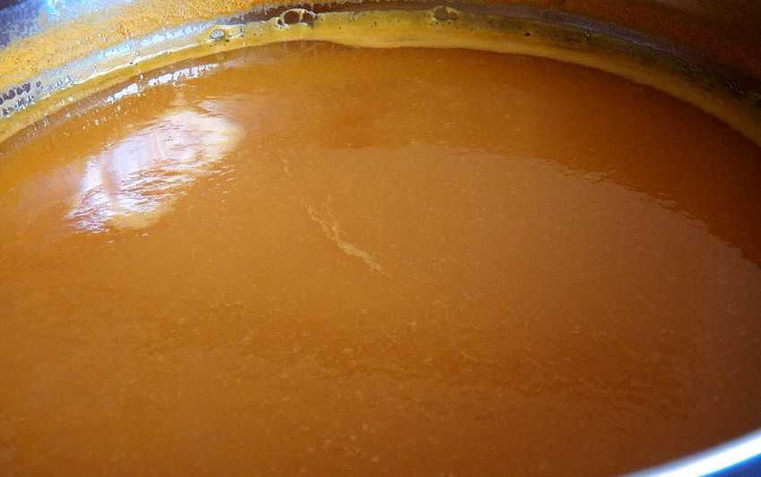 Слить в емкость и поставить на огонь, довести до кипения, постоянно помешивая. Высыпать сахар, покипятить 2-3 мин. до полного его растворения.