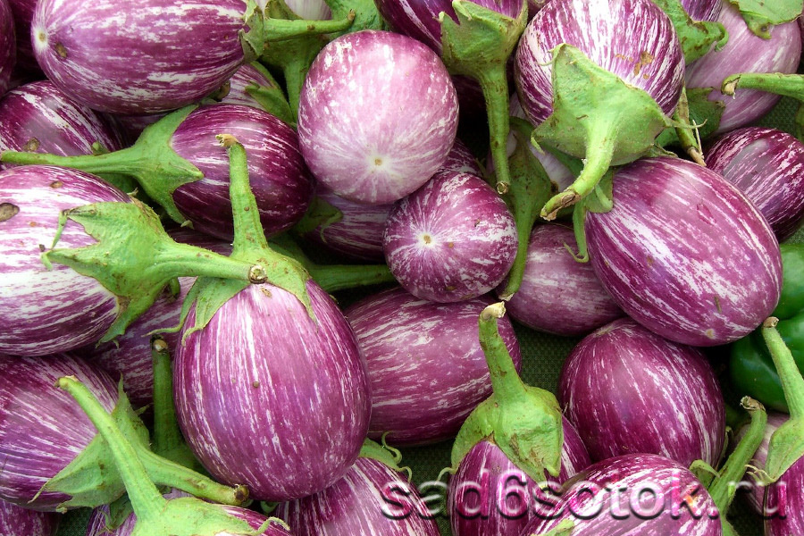 Эффектные и очень вкусные баклажаны неизменно привлекают взгляд и обязательно должны появиться на грядке. К сбору урожая приступают на 105–110 сутки после полноценных всходов. Кусты полуштамбовой формы, ветвистые, достигают 60–70 см. Овальные плоды небольшие, укороченные – длиной до 17 см, с полосатой сиренево-белой кожицей, при биологическом созревании приобретают лилово-желтую окраску. Мякоть упругая, белоснежного цвета, очень вкусная, без горчинки. Вес отборных овощей около 140 г.