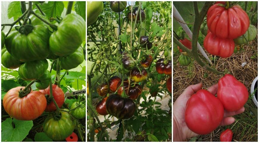 На фото ранние сорта томатов для теплицы: Винтаж; Мечта Алисы; Инжир розовый