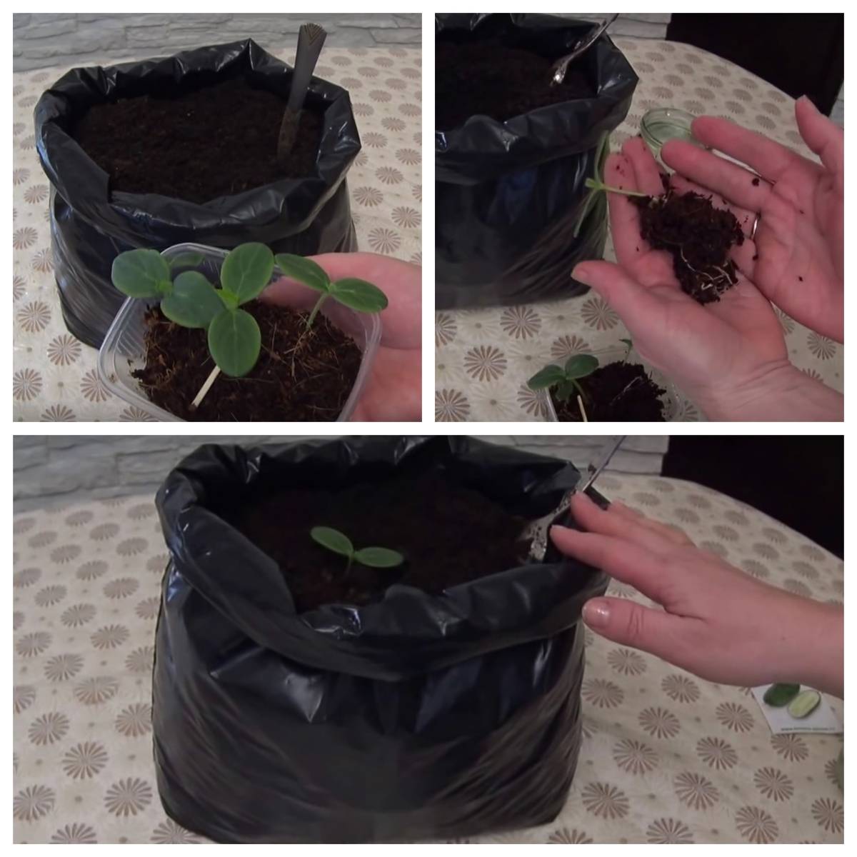 Высаживать в один пакет рекомендуют одно растение или его семя. Именно рассада считается самым надежным способом, но высадка семян также приемлема. Для посадки субстрат следует слегка увлажнить, но без застоя воды. Выкопайте соответствующего размера впадину для рассады, чтобы её можно погрузить вместе с земельным комом. Семядольные листочки не должны соприкасаться с землей, для этого вам нужно оставить между ними расстояние не менее 10 мм. Периметр посадки необходимо качественно уплотнить. Парниковый эффект не нужен, поэтому никакие накрытия вам не понадобятся. Главным условием хорошего укоренения и роста станет завернутый пакет на две третьих, который по мере роста должен постепенно расправляться и досыпаться субстратом. Это поможет создать очень мощную и надежную корневую систему, омолаживая само растение. Именно поэтому использование пакета очень удобно, так как от любой стационарной емкости будет появляться не желательная тень, если посудину полностью не засыпать землей.