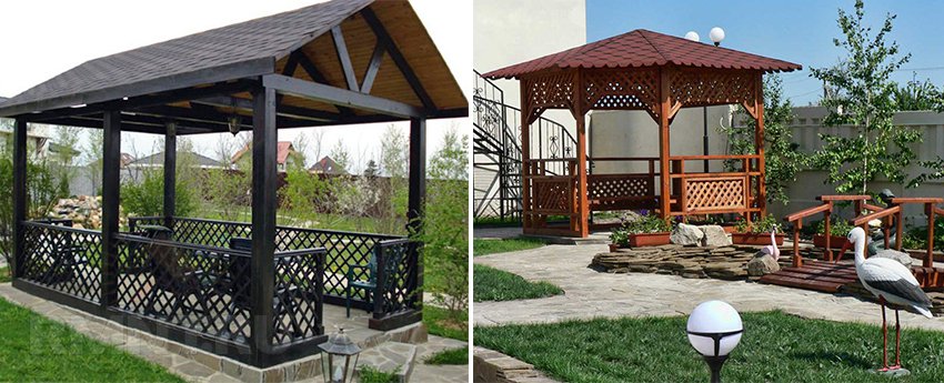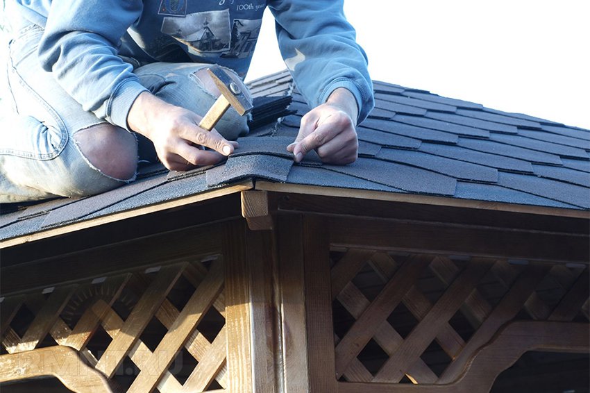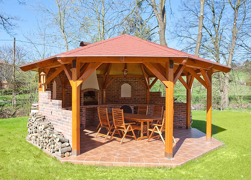 Другой вопрос: чем покрыть крышу беседки. Если внутри планируется разместить печь или мангал, то это должен быть огнеупорный материал, при этом металлочерепицу или профлист применять не рекомендуется, ведь в жаркую погоду крыша будет нагреваться, а в дождь будет много шума. Оптимальный вариант — гибкая и лёгкая мягкая кровля, на втором месте по популярности стоит битумный шифер. Бюджетные беседки кроют профлистом или рубероидом.