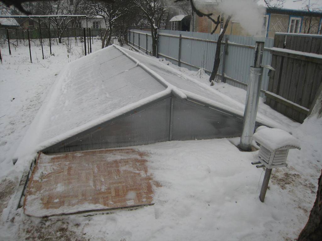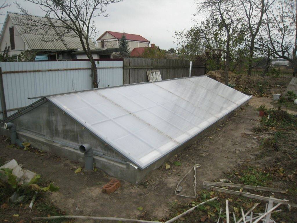 - крышу в подземной теплице изготавливают из поликарбоната, это куда лучший вариант, чем стекло, так как оно имеет больший вес и отличается хрупкостью;