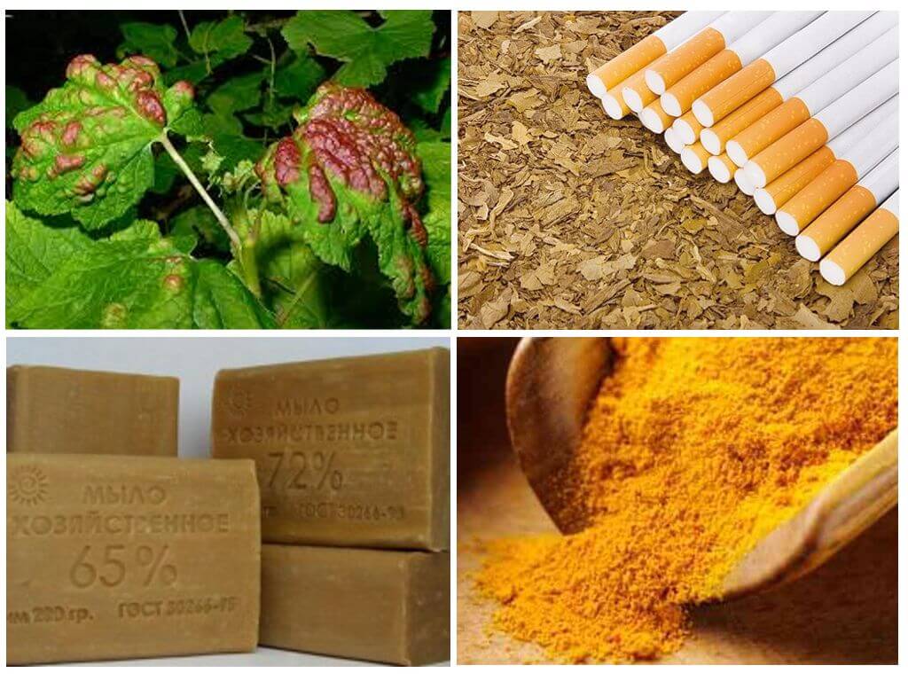 - Один из самых простых – перетереть сухой табак в пыль, побрызгать смородину мыльным раствором, посыпать поверх кустарников табачным порошком.
