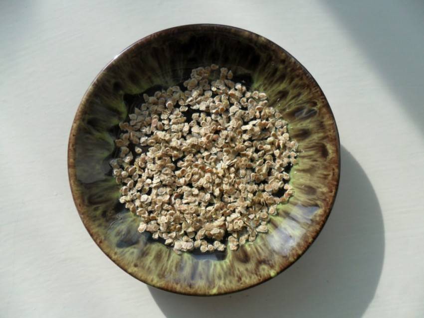 Зернышки надо выложить в мешочек из марли, опустить на полчаса в насыщенно розовый раствор марганцовки для обеззараживания.