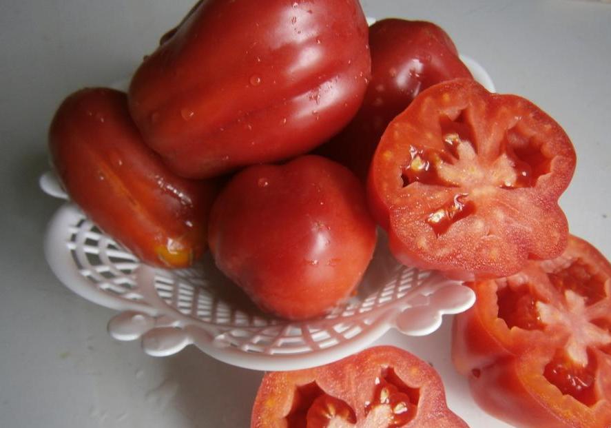 - Томаты имеют яркий красно-розовый оттенок, встречаются разновидности с желтоватыми полосками на плодах.