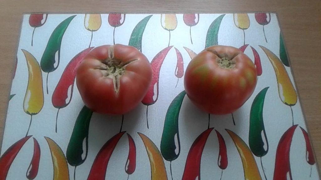 Плоды у томата крупные, плоскоокруглые, к моменту созревания имеют красные с желтыми крапинки. Масса плода 350-400 г, окрас плодов — полосатый, розовый. На вкус сладкие, семян немного. В России, особенно в средней полосе, желательно выращивать его в парнике.